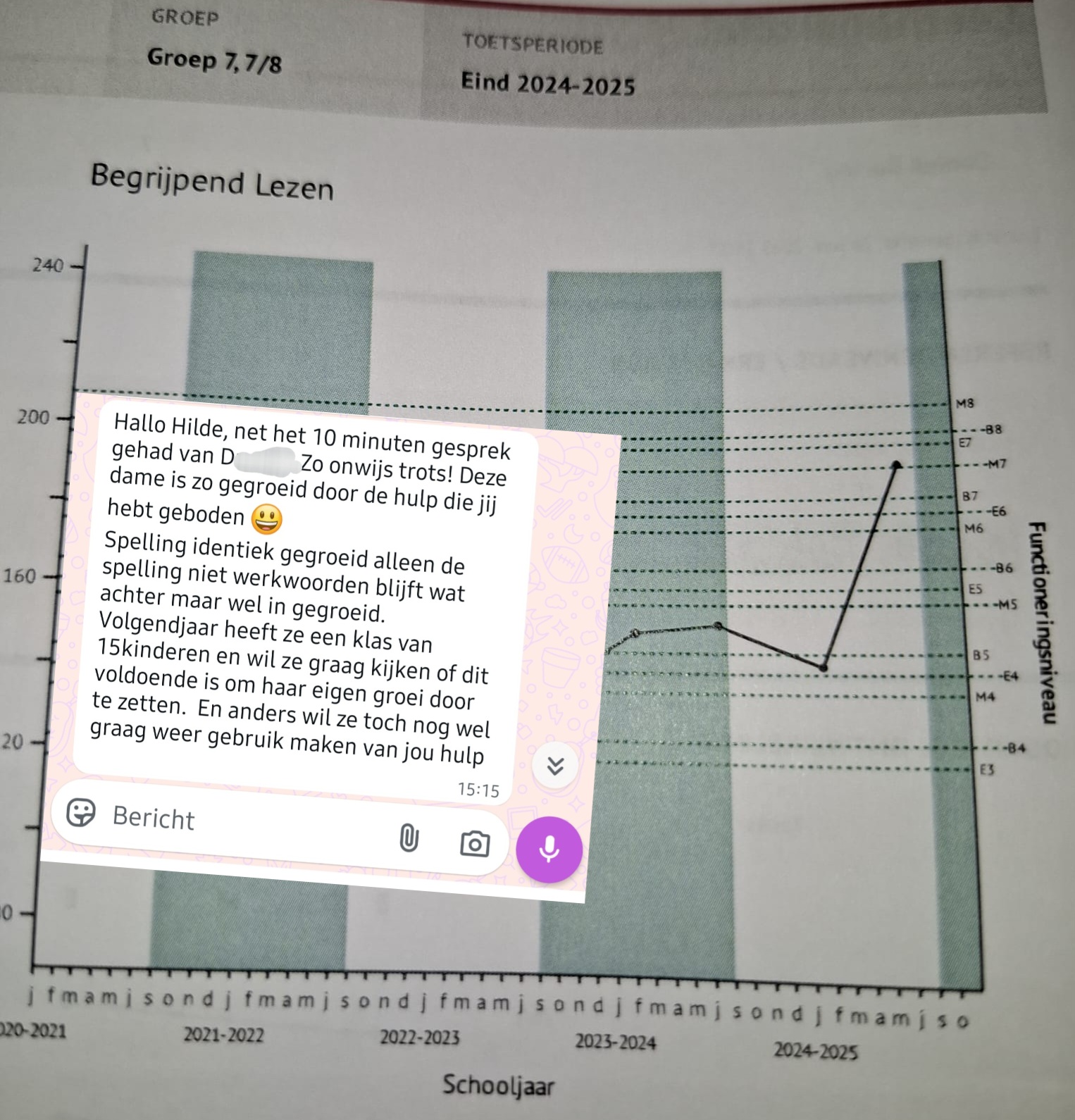 Vanaf het moment dat mijn dochter met Hilde begon te werken, zag ik een opmerkelijke verandering. Voorheen een activiteit waar ze tegenop zag, is lezen nu een bron van vreugde geworden voor mijn dochter, vooral voor het slapengaan. Haar vooruitgang is ongelooflijk en het plezier dat ze nu beleeft aan het ontdekken van nieuwe verhalen is onbetaalbaar. Hilde's betrokkenheid, expertise en warmte hebben een wereld van verschil gemaakt.